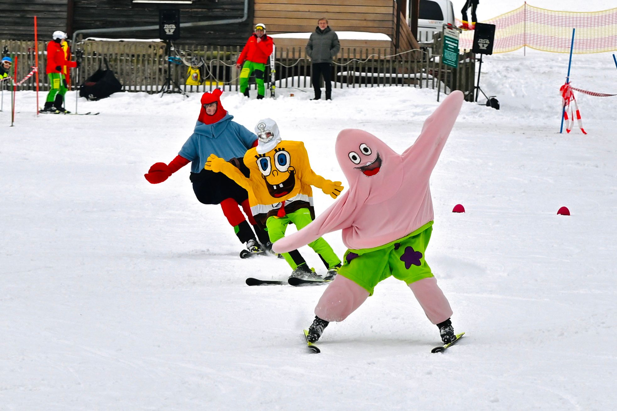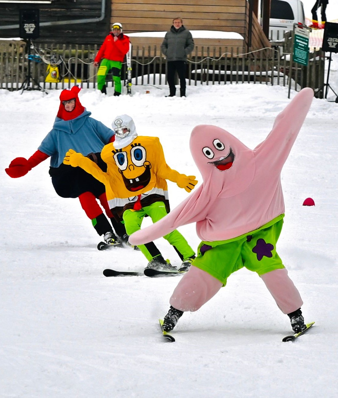 Als dann Eiskönigin Elsa mit Schwester Anna, dem Schneemann Olaf sowie dem Rentier Swen durch den Parkour zauberten war die Überraschung bei den Schülern, als auch bei den Zuschauern in den Gesichtern abzulesen. Als weitere Komikfiguren trugen Spongebob, Mr Krebs, und Riesenpatrick zur Unterhaltung des Publikums bei .